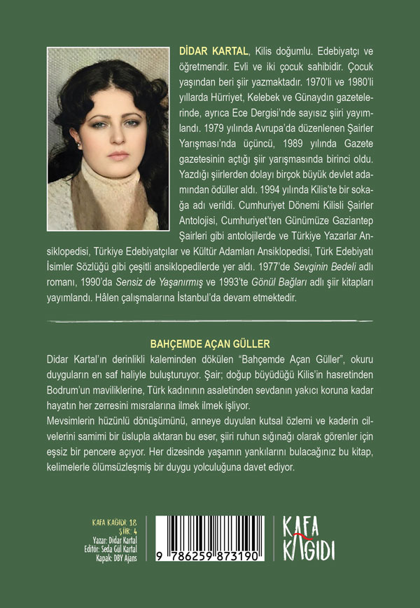 Didar Kartal’ın derinlikli kaleminden dökülen “Bahçemde Açan Güller”, okuru duyguların en saf haliyle buluşturuyor. Şair; doğup büyüdüğü Kilis’in hasretinden Bodrum’un maviliklerine, Türk kadınının asaletinden sevdanın yakıcı koruna kadar hayatın her zerresini mısralarına ilmek ilmek işliyor.