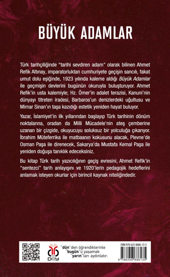 Türk tarihçiliğinde “tarihi sevdiren adam” olarak bilinen Ahmet Refik Altınay, imparatorluktan cumhuriyete geçişin sancılı, fakat umut dolu eşiğinde, 1923 yılında kaleme aldığı Büyük Adamlar ile geçmişin devlerini bugünün okuruyla buluşturuyor. Ahmet Refik’in usta kalemiyle; Hz. Ömer’in adalet terazisi, Kanuni’nin dünyayı titreten iradesi, Barbaros’un denizlerdeki uğultusu ve Mimar Sinan’ın taşa kazıdığı estetik yeniden hayat buluyor.