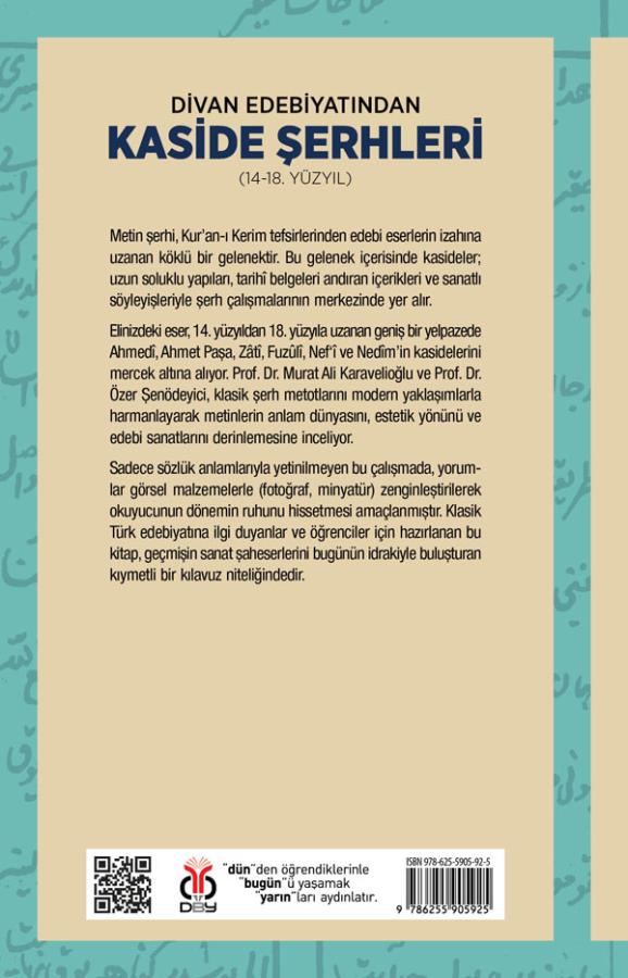 Elinizdeki eser, 14. yüzyıldan 18. yüzyıla uzanan geniş bir yelpazede Ahmedî, Ahmet Paşa, Zâtî, Fuzûlî, Nef‘î ve Nedîm’in kasidelerini mercek altına alıyor. Prof. Dr. Murat Ali Karavelioğlu ve Prof. Dr. Özer Şenödeyici, klasik şerh metotlarını modern yaklaşımlarla harmanlayarak metinlerin anlam dünyasını, estetik yönünü ve edebi sanatlarını derinlemesine inceliyor.