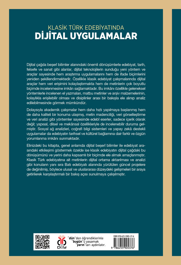 - Dijital çağda beşerî bilimler alanındaki önemli dönüşümlerle edebiyat, tarih, felsefe ve sanat gibi alanlar, dijital teknolojilerin sunduğu yeni yöntem ve araçlar sayesinde hem araştırma uygulamalarını hem de ifade biçimlerini yeniden şekillendirmektedir. Özellikle klasik edebiyat çalışmalarında dijital araçlar hem veri erişimini kolaylaştırmakta hem de metinlerin çok boyutlu biçimde incelenmesine imkân sağlamaktadır. Bu imkânı özellikle geleneksel yöntemlerle incelenen el yazmaları, matbu metinler ve arşiv malzemelerinin, kolaylıkla erişilebilir olması ve disiplinler arası bir bakışla ele alınıp analiz edilebilmesinde görmek mümkündür. - Dolaysıyla akademik çalışmalar hem daha hızlı yapılmaya başlanmış hem de daha kaliteli bir konuma ulaşmış, metin madenciliği, veri görselleştirme ve veri analizi gibi yöntemler sayesinde edebî eserler, sadece içerik olarak değil; yapısal, dilsel ve mekânsal özellikleriyle de incelenebilir duruma gelmiştir. Sosyal ağ analizleri, coğrafi bilgi sistemleri ve yapay zekâ destekli uygulamalar da edebiyatın tarihsel ve kültürel bağlamına dair farklı ve özgün yorumlanma imkânı sunmaktadır. - Elinizdeki bu kitapta, genel anlamda dijital beşerî bilimler ile edebiyat arasındaki etkileşimi göstermek özelde ise klasik edebiyatın dijital çağdaki bu dönüşümünü ve yerini daha kapsamlı bir biçimde ele almak amaçlanmıştır. Klasik Türk edebiyatına ait metinlerin dijital ortama aktarılması ve analizi gibi konuların yanı sıra Batı edebiyatı alanında yürütülen güncel projelere de değinilmiş, böylece ulusal ve uluslararası düzeydeki gelişmeleri bir araya getirilerek karşılaştırmalı bir bakış açısı sunulmaya çalışılmıştır. - Kitapta yer alan makaleler: - Dijital Uygulamalar ve Klasik Türk Edebiyatı