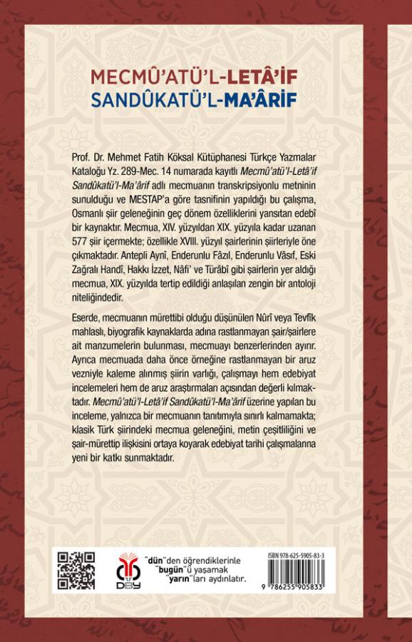 Prof. Dr. Mehmet Fatih Köksal Kütüphanesi Türkçe Yazmalar Kataloğu Yz. 289-Mec. 14 numarada kayıtlı Mecmû’atü’l-Letâ’if Sandûkatü’l-Ma’ârif adlı mecmuanın transkripsiyonlu metninin sunulduğu ve MESTAP’a göre tasnifinin yapıldığı bu çalışma, Osmanlı şiir geleneğinin geç dönem özelliklerini yansıtan edebî bir kaynaktır. Mecmua, XIV. yüzyıldan XIX. yüzyıla kadar uzanan 577 şiir içermekte; özellikle XVIII. yüzyıl şairlerinin şiirleriyle öne çıkmaktadır. Antepli Aynî, Enderunlu Fâzıl, Enderunlu Vâsıf, Eski Zağralı Handî, Hakkı İzzet, Nâfi’ ve Türâbî gibi şairlerin yer aldığı mecmua, XIX. yüzyılda tertip edildiği anlaşılan zengin bir antoloji niteliğindedir.