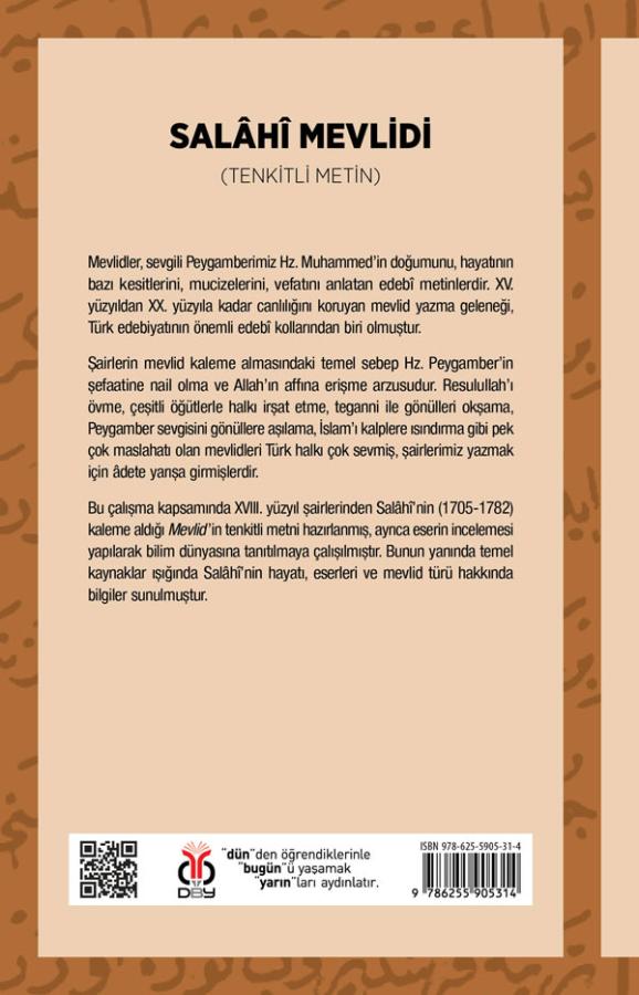 Bu çalışma kapsamında XVIII. yüzyıl şairlerinden Salâhî’nin (1705-1782) kaleme aldığı Mevlid’in tenkitli metni hazırlanmış, ayrıca eserin incelemesi yapılarak bilim dünyasına tanıtılmaya çalışılmıştır. Bunun yanında temel kaynaklar ışığında Salâhî’nin hayatı, eserleri ve mevlid türü hakkında bilgiler sunulmuştur.