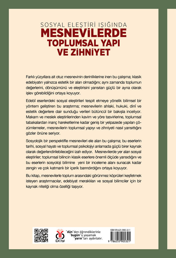 Sosyolojik bir perspektifle mesnevileri ele alan bu çalışma; bu eserlerin tarihi, sosyal hayatı ve toplumsal psikolojiyi anlamada güçlü birer kaynak olarak değerlendirilebileceğini izah ediyor. Mesnevilerde yer alan sosyal eleştiriler; toplumsal bilincin klasik eserlere önemli ölçüde yansıdığını ve bu eserlerin sosyoloji bilimine yeni bir inceleme alanı sunacak kadar zengin ve çok katmanlı bir içerik barındırdığını ortaya koyuyor.